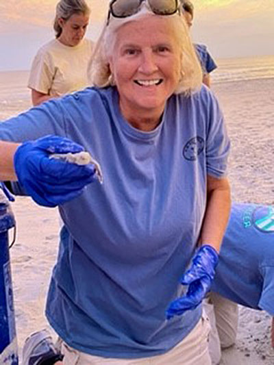 Carolyn is a native Eastern North Carolina having spent all of her summers in Atlantic Beach. In 2016 she retired with her husband to become an Atlantic Beach resident and joined the Atlantic Beach Sea Turtle rescue program in 2017. She is happiest when on the beach patrolling for newly laid nests in the early summer mornings, monitoring nests during incubation periods (rain or shine) and nurturing resulting hatchlings as they make their way to the ocean.